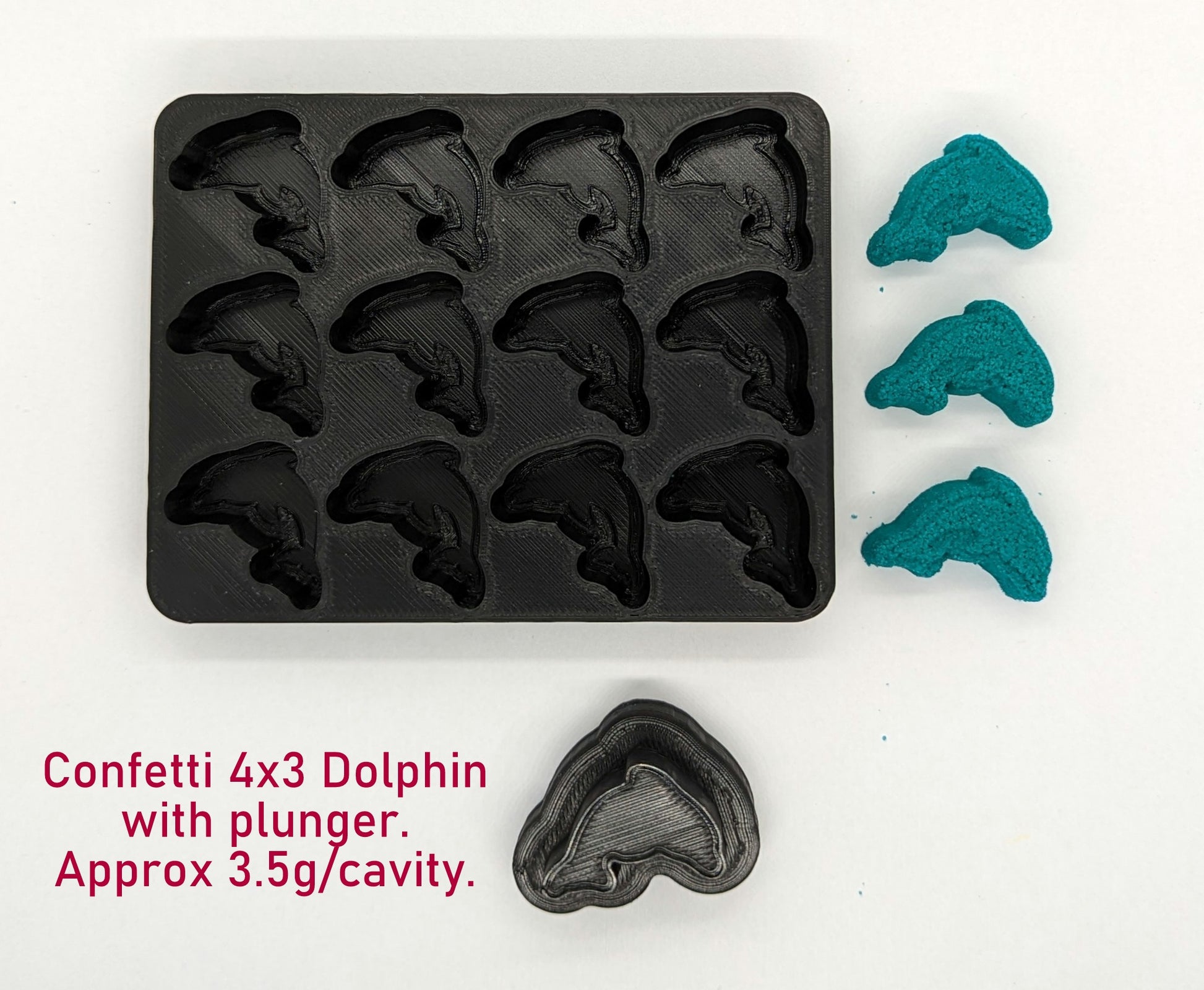 This 3D printed 4 x 3 confetti Dolphin mould comes with a plunger.