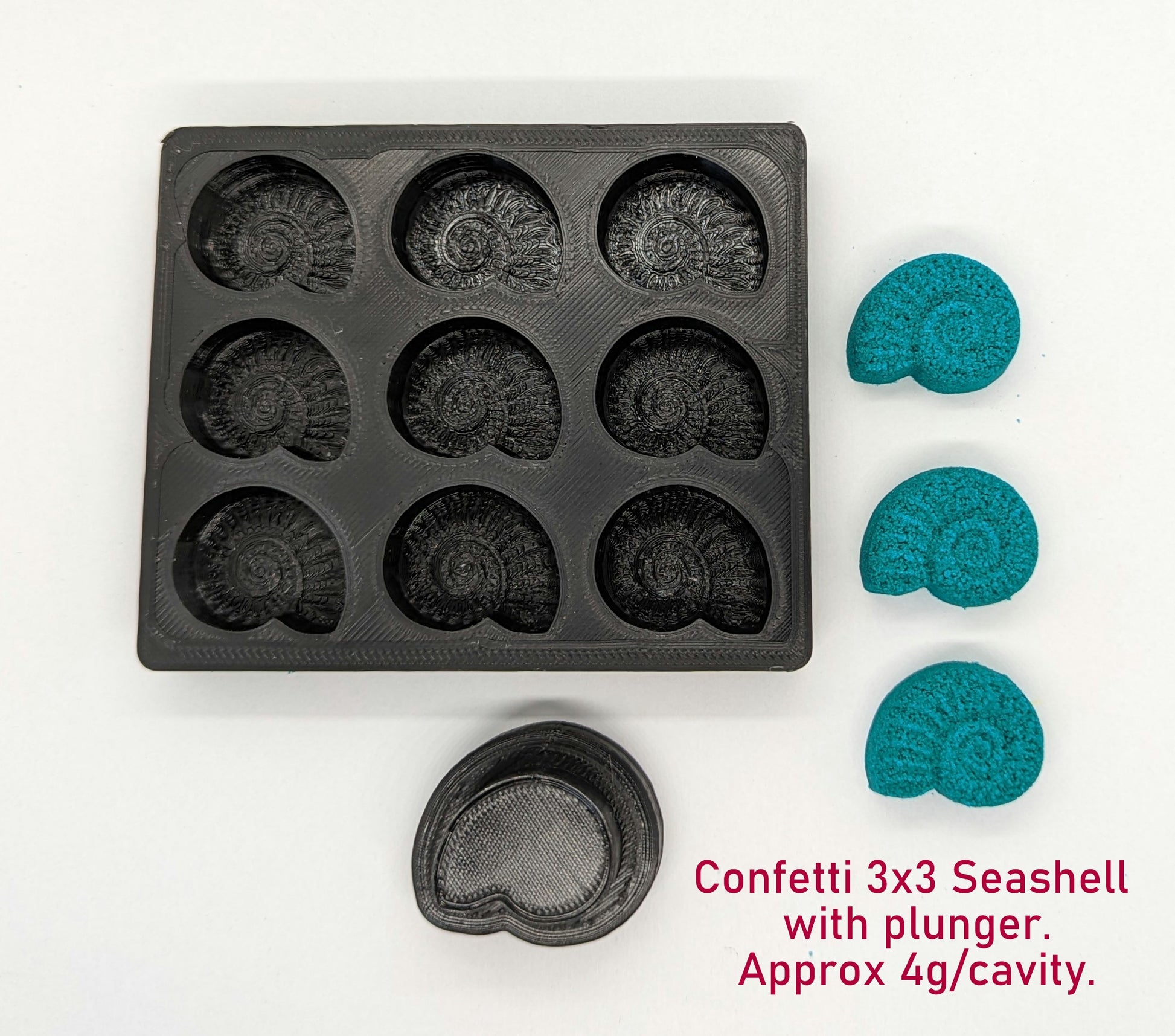 This 3D printed 3 x 3 confetti Seashell mould comes with a plunger.
